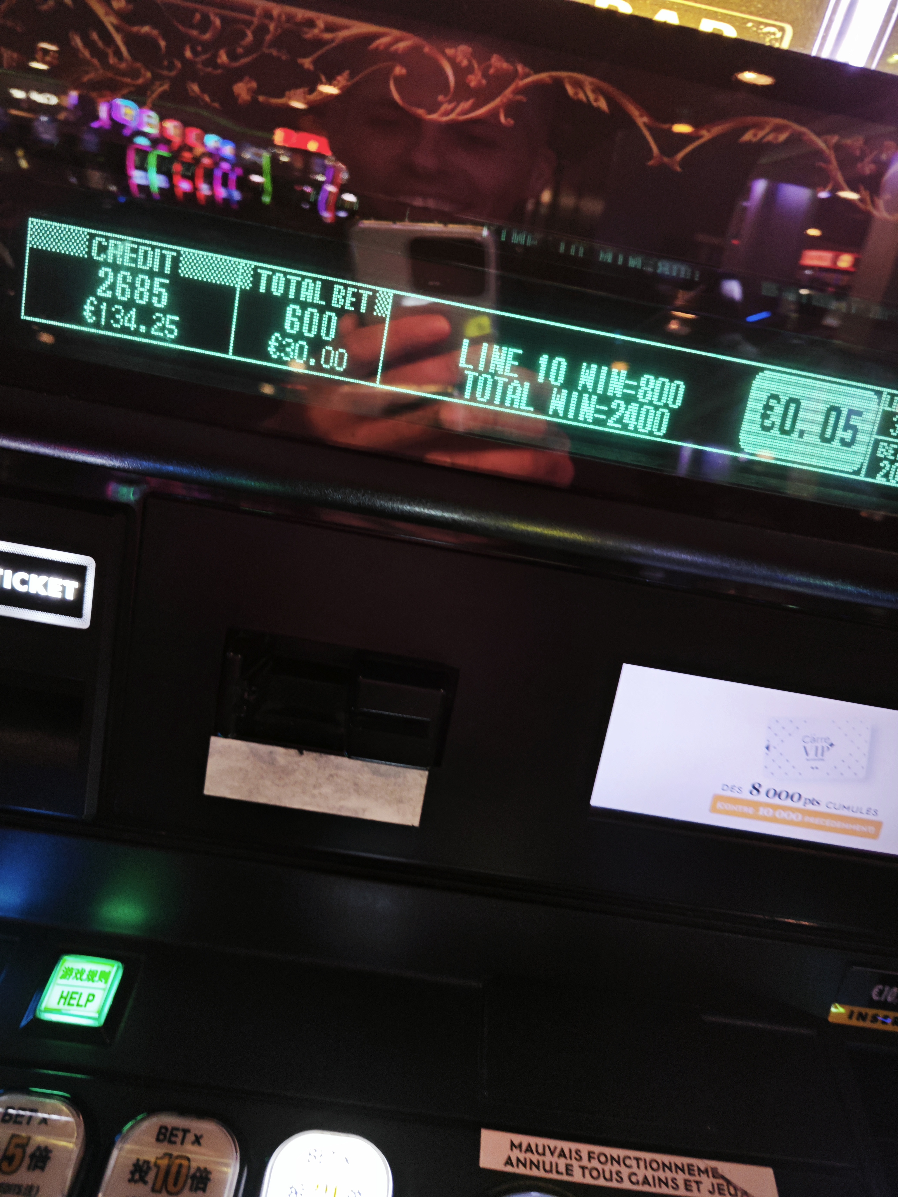 Bon choix de machines à sous. Il fait trop chaud. Sinon, le 14 décembre, on a eu droit à une boisson gratuite (sans carte VIP) et un jeton rouge pour le jeu du RC. Le 28 décembre, pas de boisson et pas de jeton de jeu !!!