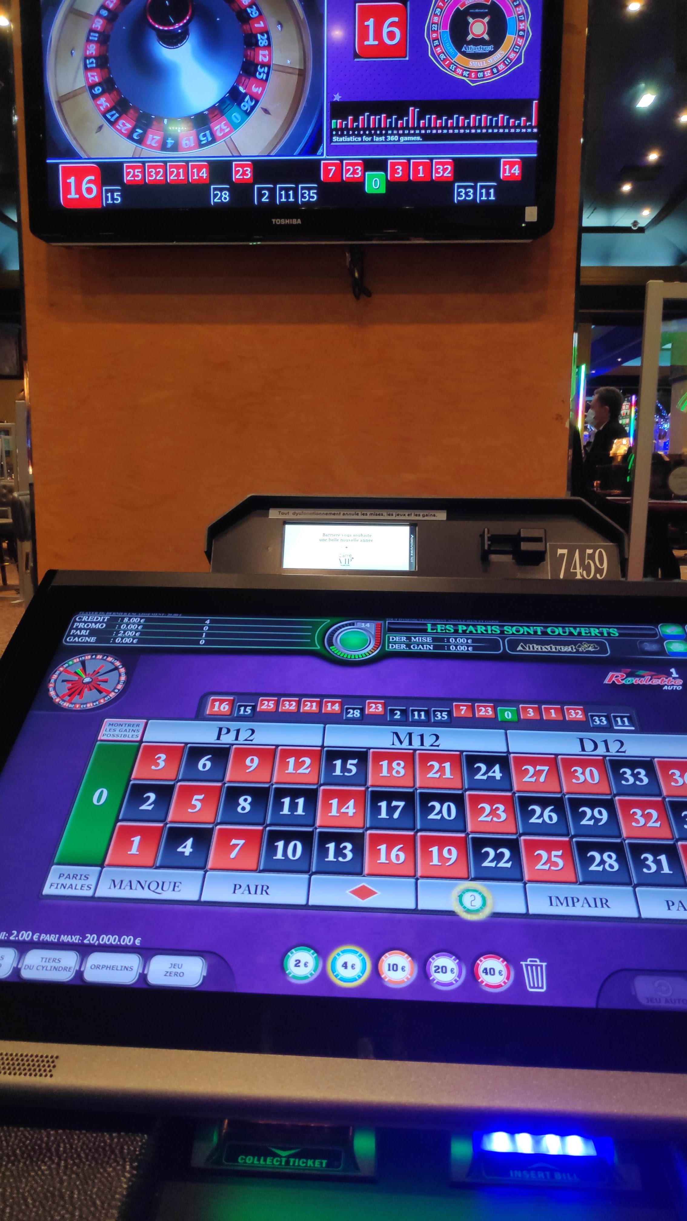 A surtout plus y aller toutes les machines sont truquée la victoire du casino est de 90% source depuis mes nombreuses années passée là-bas il s’enrichisse déjà pour l’entrée payante à 16€ et pas de Conso avec tout est calculé pour perdre arrêtez et rebrousser votre chemin chère compatriote gardez votre argent à ces moment de crise !