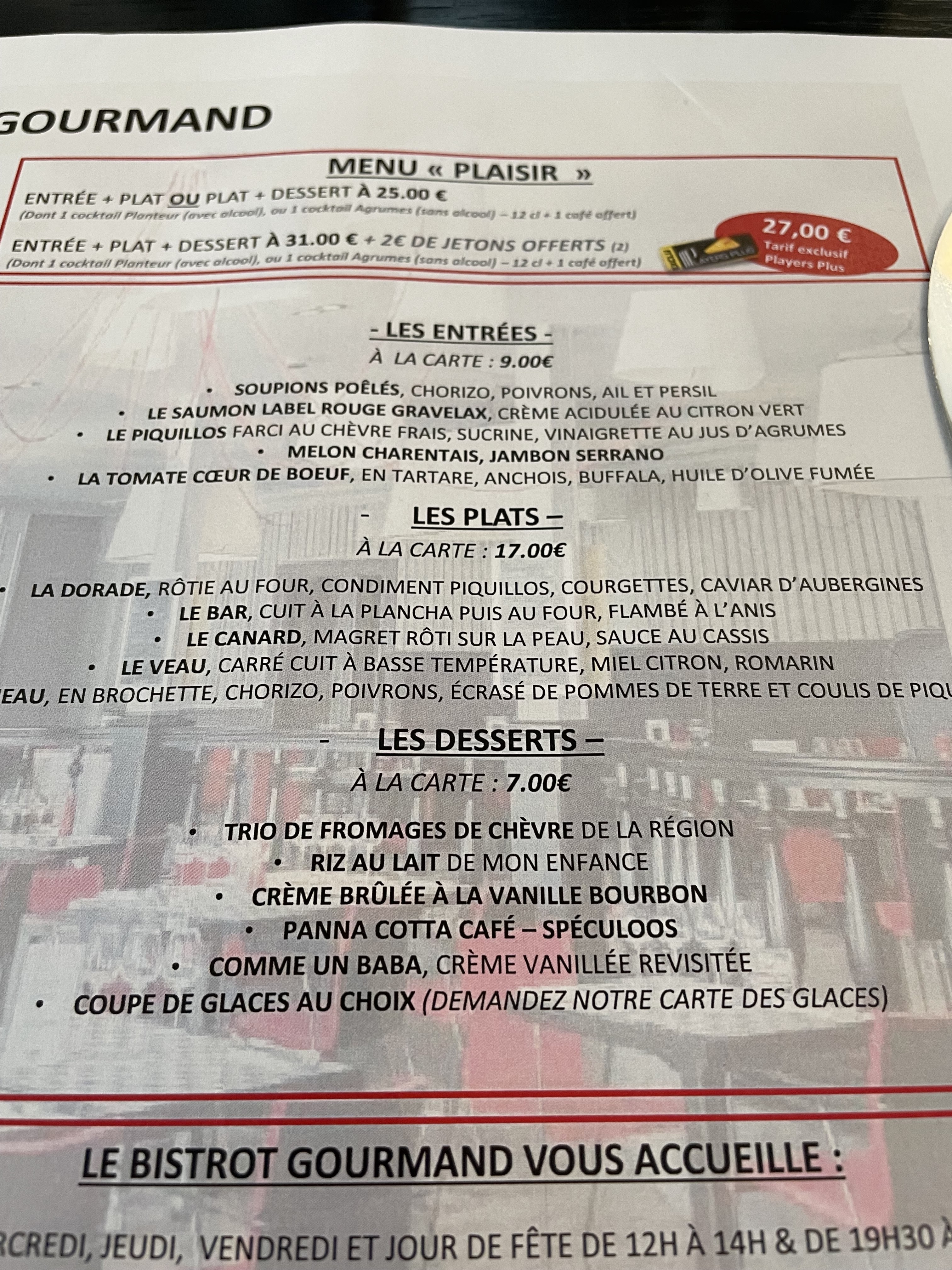 Dîner au Bistrot Gourmand hier soir. Très bon rapport qualité-prix. Une jolie carte proposée. Je vous le recommande. En plus, vous pouvez également profiter du Casino, si le cœur vous en dit, et qui sait gagner quelques gains😁.