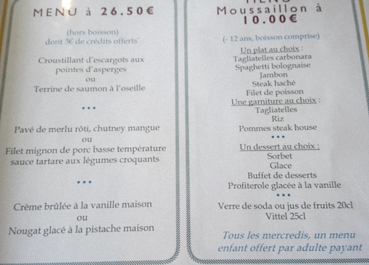 Personnel agréable, 5 menus adultes au choix. le mercredi midi, menu enfant offert pour menu adulte acheté