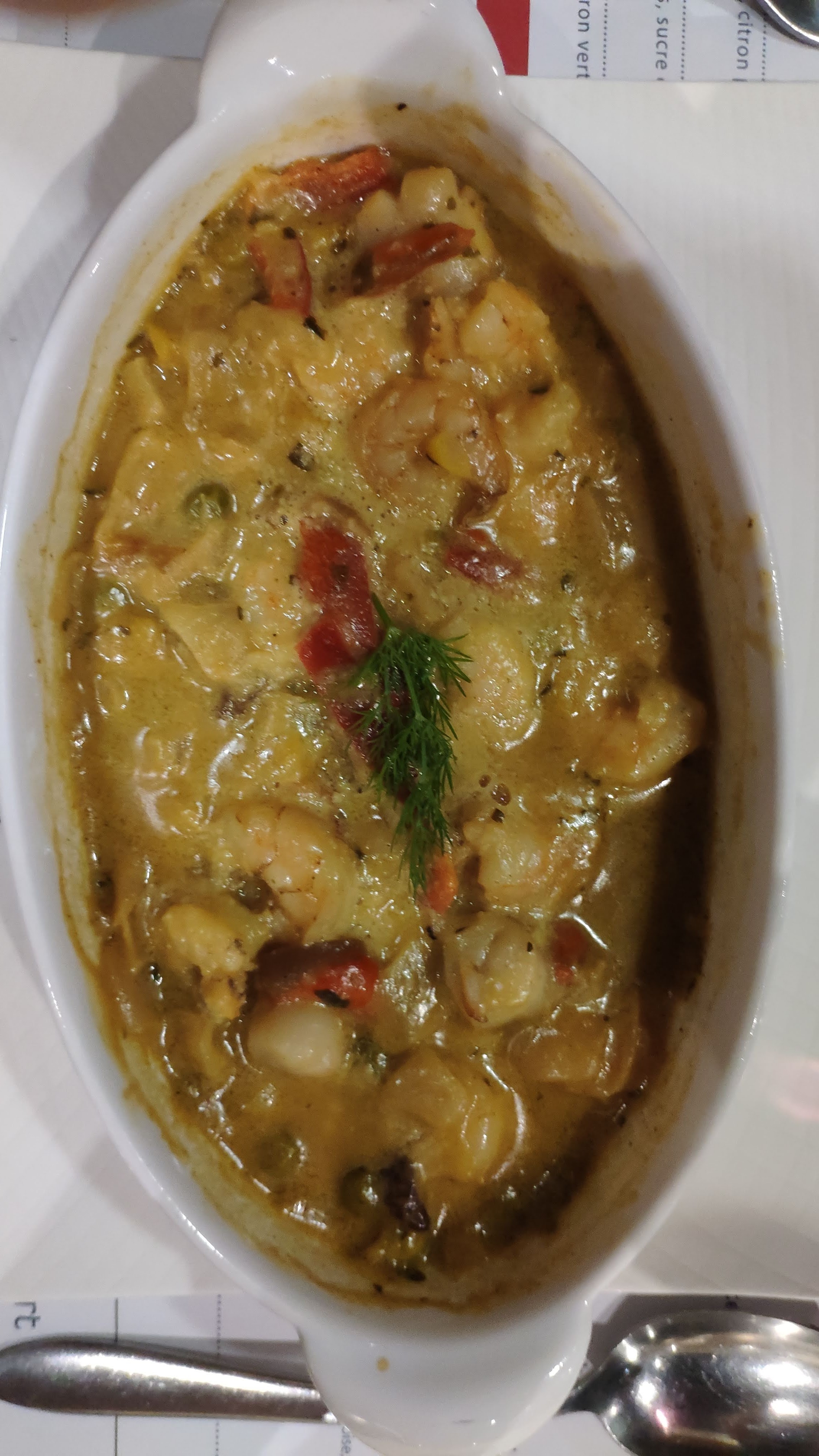 Avis sur restaurant Kasino Apero Mojitos sans aucun goût Entrée Cassolette crevettes coquilles saint Jacques au curry Au lieu de coquilles 3 pétoncles parmis les crevettes Plat Bar crème citronnée Sauce citron insipide et farineuse , ensemble donnant l'impression de réchauffé Faux filet sauce chorizo Sauce au surprenant goût de fromage non épicée Pour tout dire repas décevant mais personnels efficaces et agréables